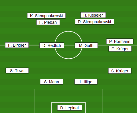 | Aufstellung | D. Lepinat - S. Tews, S. Mann, L. Illige, S. Krüger - F. Birkner, D. Redlich, M. Guth, P. Normann (E. Krüger) - K. Stempnakowski (F. Pleban), H. Kieseler (R. Stempnakowski) |