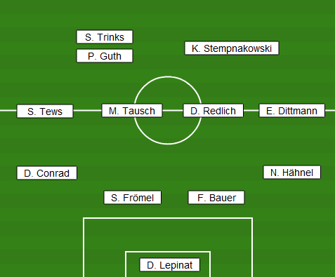 | Aufstellung | D. Lepinat - D. Conrad, S. Frömel, F. Bauer, N. Hähnel - S. Tews, M. Tausch, D. Redlich, E. Dittmann - S. Trinks (46. P. Guth), K. Stempnakowski |