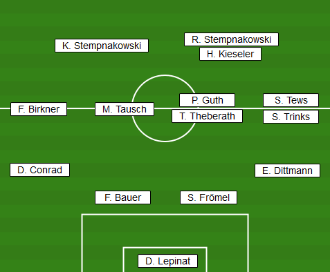| Aufstellung | D. Lepinat - D. Conrad, F. Bauer, S. Frömel, E. Dittmann - F. Birkner, M. Tausch, P. Guth (ca. 60. T. Theberath), S. Tews (85. S. Trinks) - K. Stempnakowski, R. Stempnakowski (ca. 70. H. Kieseler) |