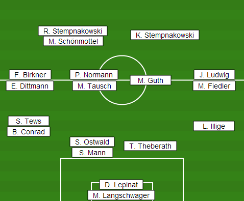 | Aufstellung | D. Lepinat (M. Langschwager) - S. Tews (B. Conrad), S. Ostwald (S. Mann), T. Theberath, L. Illige - F. Birkner (E. Dittmann), P. Normann (M. Tausch), M. Guth, J. Ludwig (M. Fiedler) - R. Stempnakowski (M. Schönmottel), K. Stempnakowski |