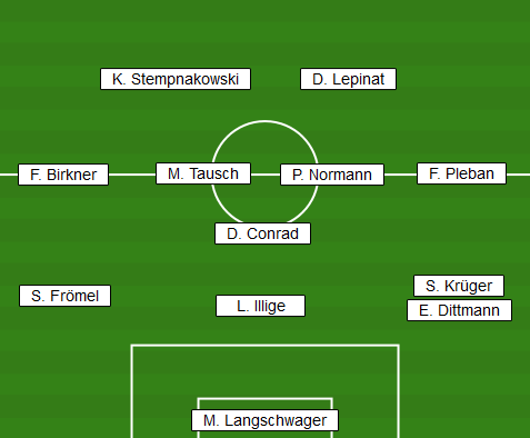 | Aufstellung | M. Langschwager - S. Frömel, L. Illige, S. Krüger (E. Dittmann) - D. Conrad, F. Birkner, M. Tausch, P. Normann, F. Pleban - K. Stempnakowski, D. Lepinat |