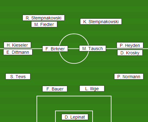 | Aufstellung | D. Lepinat - S. Tews, F. Bauer, L. Illige, P. Normann - H. Kieseler (E. Dittmann), F. Birkner, M. Tausch, P. Heyden (D. Krosky), R. Stempnakowski (M. Fiedler), K. Stempnakowski |