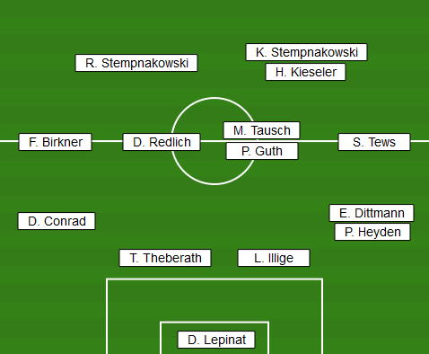 | Aufstellung | D. Lepinat - D. Conrad, T. Theberath, L. Illige, E. Dittmann (64. P. Heyden) - F. Birkner, D. Redlich, M. Tausch (69. P. Guth), S. Tews - R. Stempnakowski, K. Stempnakowski (90.+1 H. Kieseler) |